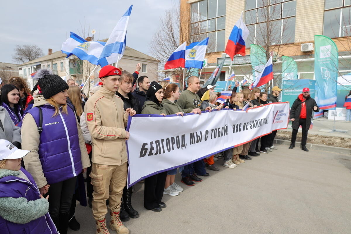 Жители Херсонской области собрались на митинг в поддержку Белгородской области, которая прямо сейчас страдает от террористических атак со стороны Украины. Акция прошла в центре Геническа.