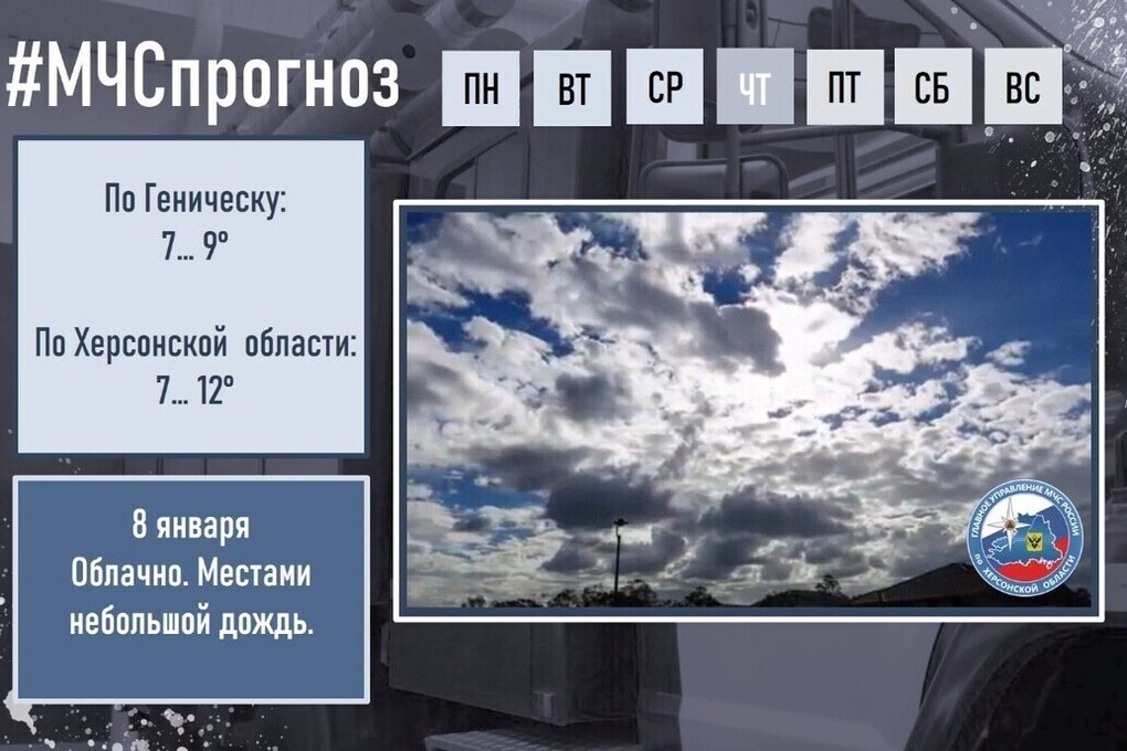 О прогнозе погоды на 8 января в Геническе и муниципальных округах Херсонщины сообщает ГУ МЧС России.