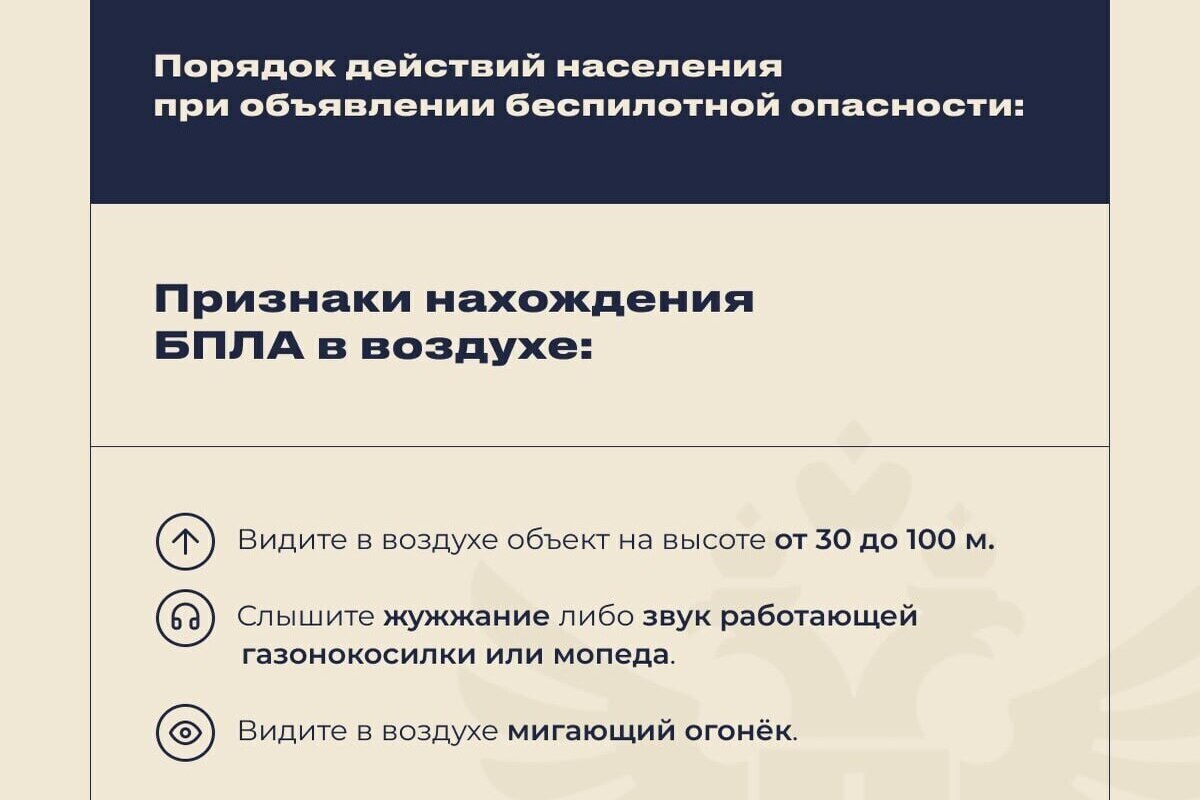 Если Вы находитесь на улице, зайдите в ближайшее здание. Если Вы заметили в небе беспилотник, сообщите об этом по номеру 112. Не следует паниковать.